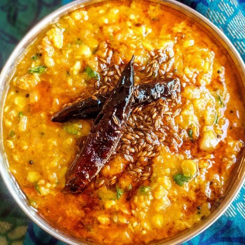 Gele linzen gekookt in een boter-tomaat basis met ui en kruiden